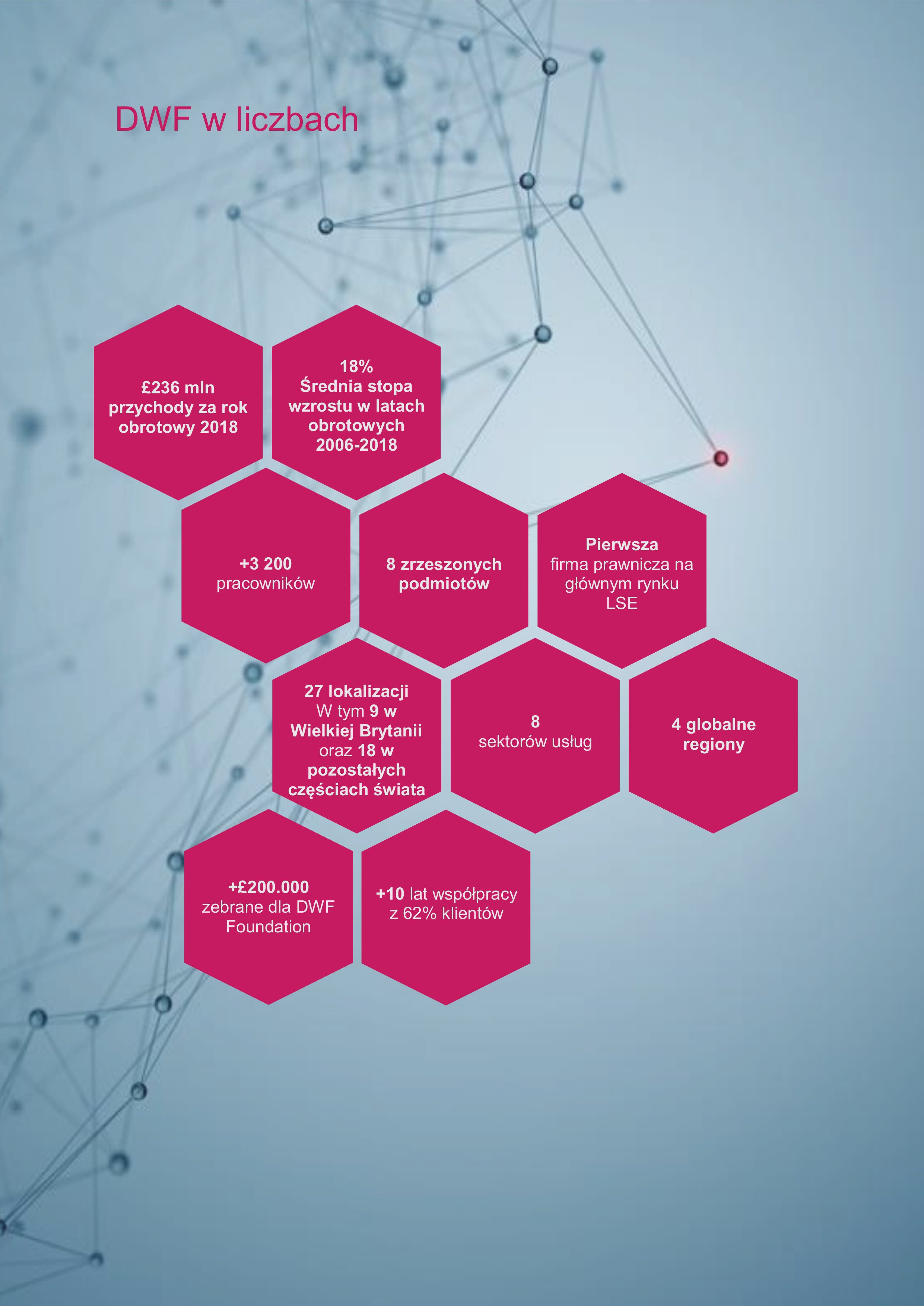 DWF jest pierwszą i jedyną globalną firmą prawniczą notowaną na rynku podstawowym giełdy London Stock Exchange; zatrudnia ponad 3200 osób